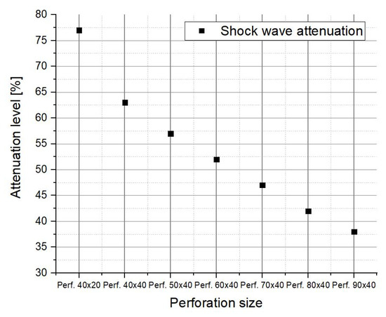 Considering the total value of the impulse (both humps), the attenuation factor dramatically decreases (Figure 17), emphasizing that the presence of a secondary blast wave can severely affect the perforated plate’s performance.