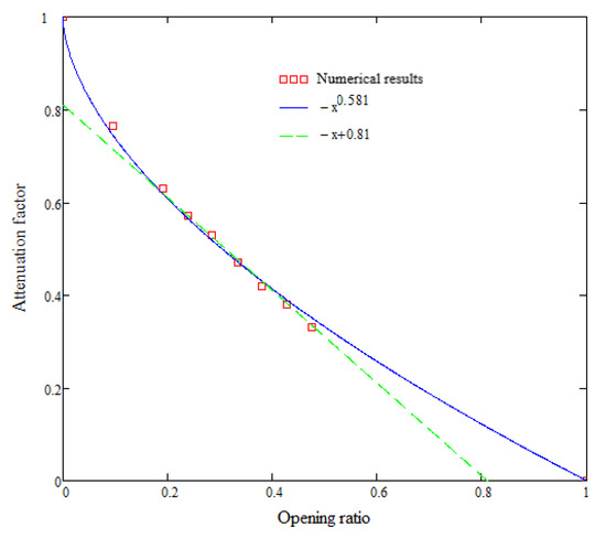 Including both range ends, in Figure 18, the attenuation factor plot for the total impulse can be expressed as a power function (the solid line), somehow similar to the one reported in [18] for the pressure. If the attenuation is discussed for a narrow interval of the opening ratio, 0.2–0.5, the attenuation factor can be easily approximated as a linear function (dashed line) (Figure 18).