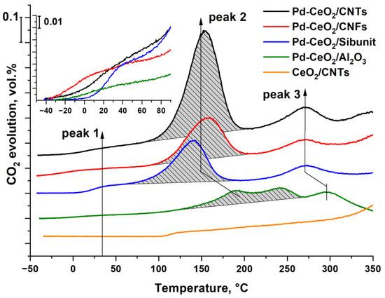 | Catalyst | T2,°C | T3,°C | CO2-2, μmol/g | CO2-2/Pd | CO2-Σ, μmol/g |