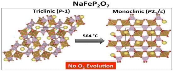 Phase transition from triclinic (P-1) to the ground state monoclinic (P21/c) polymorph above 560 °C of NaFeP2O7. Reproduced with permission [], Copyright 2013, American Chemical Society.