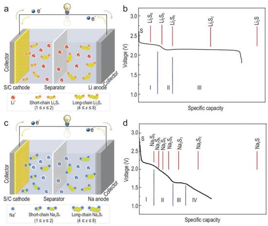 In fact, Na-S and Li-S batteries are chemically similar but not identical []. The theoretical capacity of the Na-S battery is 1274 Wh/kg, and the theoretical capacity of the Li-S battery is 2600 Wh/kg []. The multi-step reaction between the metal anode and the S cathode is mainly involved in Li-S and RT Na-S batteries, as shown in the common multi-platform phenomenon in discharge profiles (Figure 4b,d) []. Regarding the reaction process, ions (Na+ or Li+) resulting from the anodized oxidation of the alkali metals reach the S cathode and produce a string of intermediate products, such as soluble polysulfide Na2S8, Na2S6 and Na2S4 and baffling devices Na2S3 and Na2S2, which are finally fully converted to Na2S. Based on the fact that there are two electron transfers per mole, the academic definite capacity of S is extremely high, up to 1675 mA h/g, corresponding to the production of Li2S or Na2S [].