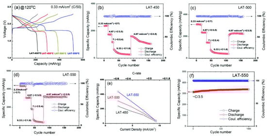 Battery performance of Na-S cells at 120 °C. (a) Voltage profiles of cells containing BASE treated with lead acetate trihydrate (LAT) at various temperatures. (b–d) Capacity and Coulombic efficiency for the Na-S cells containing BASE treated with LAT at 450, 500, and 550 °C, respectively. (e) Specific capacity retention with respect to current density (C-rate). (f) Stable long-term cycling (C/3.5 and 1000 cycles) performance of the Na-S cell containing BASE treated with LAT at 550 °C. Reproduced with permission [], Copyright 2020, Royal Society of Chemistry.