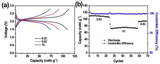 (a) Charge and discharge voltage profiles and (b) cycling performance of NaTi2(PO4)3/Na cell with an H-NASICON pellet electrolyte at different C-rates and 65 °C. Reproduced with permission [], Copyright 2016, Scientific Reports.