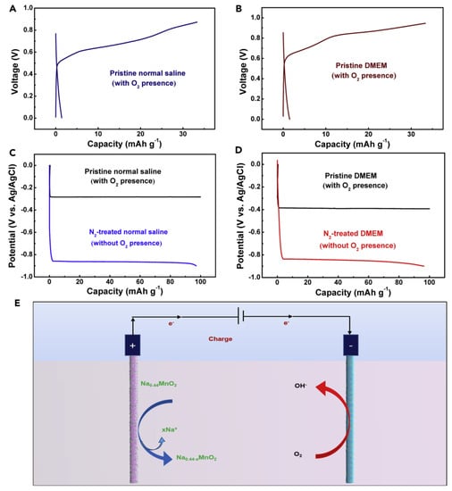 Electrochemical deoxygenation function of fiber-shaped aqueous SIBs. (A,B) Galvanostatic charge-discharge curves at a current density of 0.2 A g−1 of the fiber-shaped SIBs using pristine normal saline (with O2) (A) and pristine DMEM (with O2) (B) as electrolyte. The charge time was controlled at 10 min for preventing the oxygen revolution reaction; (C) Discharge curves (tested at a current density of 0.2 A g−1) of the fiber-shaped CNT/NaTi2(PO4)3@C hybrid electrodes in pristine normal saline solution with O2 (black line) and in N2-treated normal saline solution without O2 (blue line); (D) Discharge curves (tested at a current density of 0.2 A g−1) of the fiber-shaped CNT/NaTi2(PO4)3@C hybrid electrodes in pristine DMEM solution with O2 (black line) and in N2-treated DMEM solution without O2 (red line); (E) Schematic showing the operation mechanism of the deoxygenation function of the fiber-shaped aqueous SIB. The CNTs have catalytic activity for O2 electrochemical reduction, which was demonstrated in our previous report Reproduced with permission [], Copyright 2017, Science Direct.