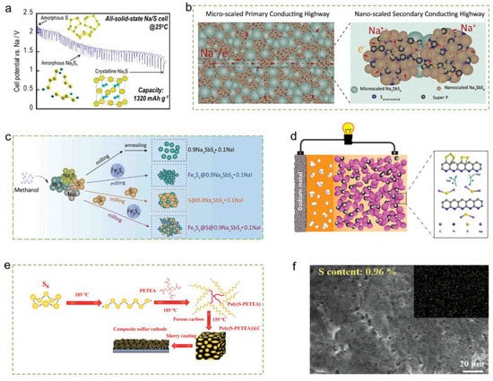 In general, Na-S batteries comprise a sodium-metal anode, an organic liquid electrolyte and a sulfur–carbon composite cathode, as exhibited in Figure 1a. Notably, the exploration of the reaction mechanism of Na-S batteries has continued for decades []. It has been proven that the generated Na+ ions during the discharge process will pass through the electrolyte and then react with sulfur at high temperatures (300–350 °C) [], which simultaneously results in the decreases in sulfur on the cathode [].