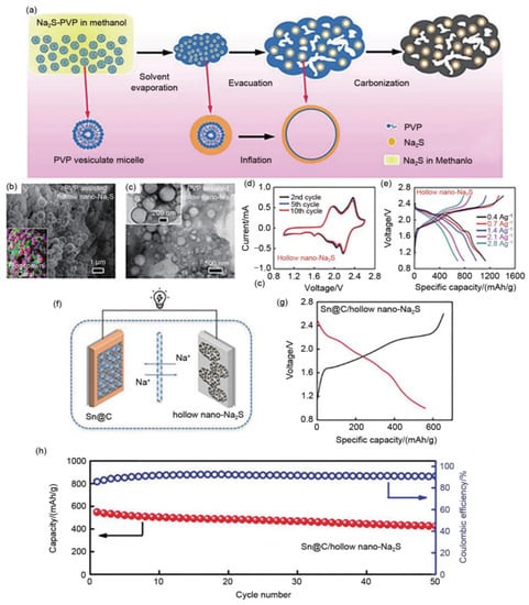 A frog-egg coral-like composite anode material with Na2S hollow spheres embedded in a porous conductive carbon skeleton was successfully prepared by mixing commercial Na2S pellets (hollow nano Na2S composite) with polyvinylpyrrolidone (PVP) and methanol solution after solvent evaporation, evacuation and carbonization (Figure 10) [].