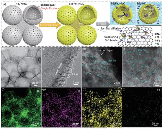 Zhang et al. reported that the introduction of atomic-scale Co catalysts in the design of S cathodes could catalyze the decomposition of the intermediate product Na2S4 and inhibit the shuttle effect of polysulfides. Meanwhile, Zhang et al. originally proposed a bifunctional mechanism for atomic Fe catalysts, using atomic Fe catalysts to disperse the sulfur cathode, weaken the S-S bond in the polysulfide, improve the reactivity of the polysulfide, accelerate the diffusion rate of sodium ions, and successfully suppress the shuttle effect. The first cycle-specific capacity of 1650 mAh/g and the current density of 100 mA/g were obtained, and the specific capacity was maintained at 540 mAh/g after 500 cycles, which opened up a new avenue for the preparation of high-performance cathode materials (Figure 11) [].