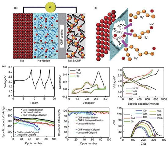 (a) Schematic of a Na‖Na-Nafion/AC-CNF coating‖Na2S/AC-CNF cell, (b) Schematic of the ionic selectivity of the Nafion membrane, (c) The electrochemical performance of Na‖Na-Nafion/AC-CNF coating‖Na2S/AC-CNF cell. Reproduced with permission [], Copyright 2016, American Chemical Society.