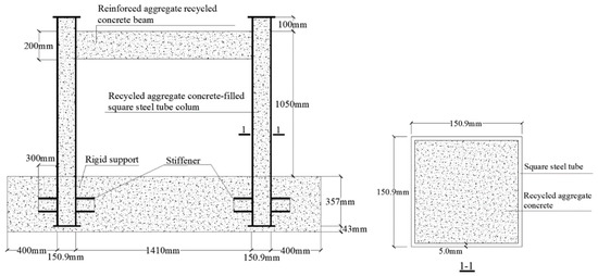 The S-RACFST frame seismic test model that was constructed and completed in the group’s previous study [23] was selected for the current work. The frame structure geometry of the model is shown in Figure 1. The applied coarse aggregates were RCAs obtained from the waste concrete specimens in the Key Laboratory of Disaster Prevention and Structural Safety of China, Ministry of Education. The physical properties of the RACs are provided in Table 1. The strength grade of the RAC in regard to the steel tube and beam was C40; the replacement ratio of the recycled coarse aggregate was 100%; the physical properties of the recycled aggregate and the steel tube grade was Q235; and the test axial compression ratio was taken as 0.8. The frame-specific design parameters, reinforcement, and material properties were reported, in detail, in a previous study by the group [23].