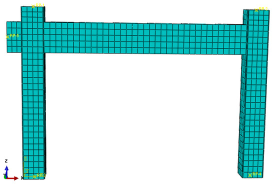 The mesh division density is very crucial for the finite element model analysis calculation. First, with respect to the initial analysis, a reasonable mesh division was taken. Then, the mesh density division was doubly expanded and then analyzed again. Next, the two results were compared until the two differences were found to be less than 1%. Then, the size of 40 mm was finally chosen. The mesh division in regard to the finite element model of the S-RACFST frame specimen is shown in Figure 2. Further, the mesh division of the interior RAC and the square steel tube components are shown in Figure 3.