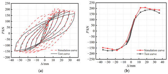 Figure 4a shows the results of the finite element hysteretic simulation curve for the S-RACFST frame specimen when compared with the test. The hysteretic test curve is derived from the previous research results of our group [23]. In addition, it is shown that the hysteretic curve obtained from the simulation generally agrees well with the test. The simulation curves of the elastic phase during the positive and negative loading process agree with the test curves. Furthermore, the hysteretic simulation curve in the elastic–plastic stage exhibits a higher loading stiffness than the hysteretic test curve. Moreover, the hysteretic loop area obtained from the finite element is slightly larger than the test. The difference between the hysteretic loop areas is relatively more pronounced in the later loading period. The reason for this is that the geometric defects, concrete cracks, and damage during the test are not fully considered in the simulation analysis. Therefore, the bearing capacity and hysteresis loop area obtained from the simulation are higher than those found in the test. Overall, the model can simulate the whole process of specimen development under reciprocal loading.