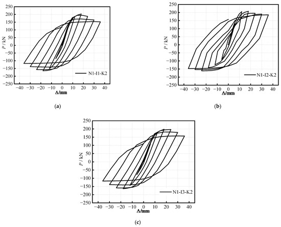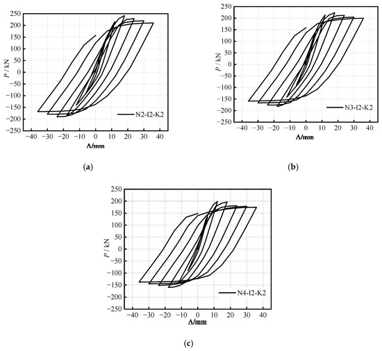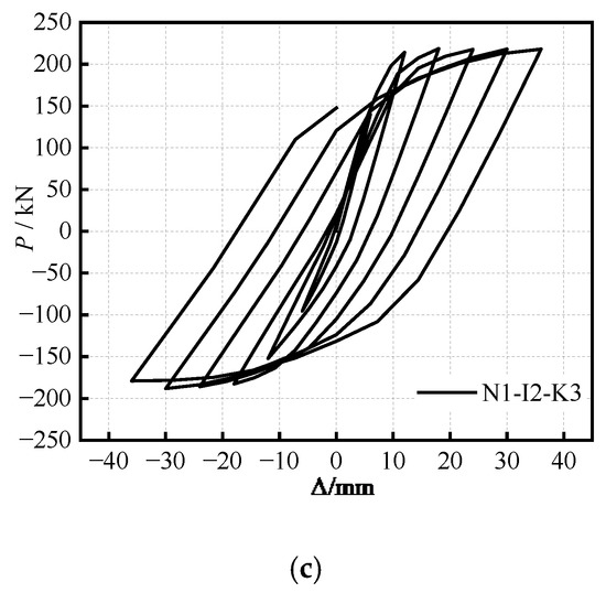 Hysteretic curves of specimens under different (n): (a) n = 0.2; (b) n = 0.3; (c) n = 0.4.
