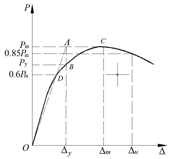 The S-RACFST frame specimen’s yield point could be determined via using the graphical method as reported by Chen et al. [22], as shown in Figure 8. With respect to the load–displacement curve, the loading value corresponding to 0.6 Pm was determined and used in order to construct a straight line that was parallel to the horizontal axis, i.e., the line intersecting the load–displacement curve at point D. Subsequently, a diagonal line was drawn through the origin, and the horizontal line of the peak loading at point A was extended. The load–displacement at point B was then crossed as the vertical line of the abscissa through point A. Moreover, B was marked as the equivalent yield point, and the constant load and displacement were termed the yield load Py and the yield displacement Δy. The failure point was the loading value (0.85 Pm) and the limit displacement (Δu) of the corresponding point as the peak loading dropped to 85%.