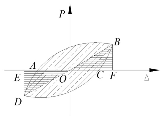 where SABCD represents the envelope area of a complete hysteresis loop. In addition, SBOF + SAOD represents the sum of the areas of the triangles consistent with the upper and lower climaxes of the specimen loading hysteresis loop, as shown in Figure 9.