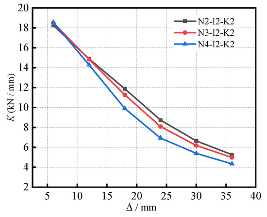 The stiffness degradation curves of the specimens under different (n) are shown in Figure 10. Additionally, the specimens exhibit a gradual stiffness degradation for the different (n). At the (n) of 0.2, the initial stiffness of the specimen was observed to be 18.26 kN/mm. At the (n) of 0.3, the initial stiffness of the specimen was observed to be 18.50 kN/mm. Likewise, at the (n) of 0.4, the initial stiffness of the specimen was 18.56 kN/mm. As the (n) increased from 0.2 to 0.4, the initial stiffness of the specimens was noted to be similar. With a gradual increment in the load and displacement, the cracks in the specimens continue to generate and expand; further, the stiffness demonstrates a downward trend. From the initial point to the peak point, the stiffness decreased rapidly. After reaching the peak loading, the stiffness degradation rate decreased, and the curves tended to become flat. In general, the stiffness of the specimens with different (n) tended to decrease with increasing displacement, thus revealing a rapid decline in the beginning, as well as a gradual plateauing.