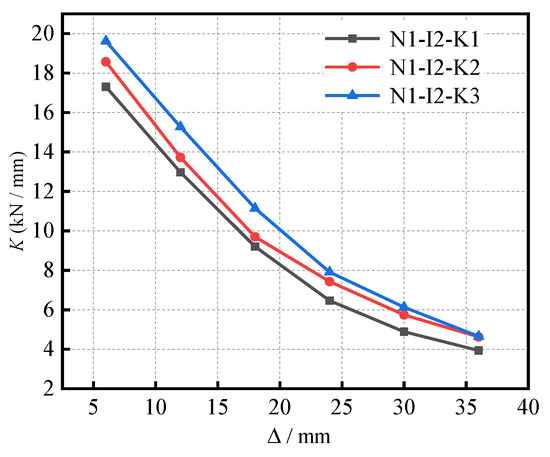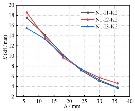 The stiffness degradation curves of the S-RACFST frame specimens under different (i) are shown in Figure 11. With respect to the (i) of 0.62, 0.41, and 0.31, the initial stiffness of the specimens was determined to be 17.55 kN/mm, 18.57 kN/mm, and 15.50 kN/mm, respectively. Thus, with respect to the (i) of 0.31, 0.41, and 0.62, the initial stiffness of the specimens was changed by 19.8% and −5.49%, respectively. The reason for this was the fact that the secant stiffness of the specimens deteriorated rapidly with the cracks of recycled concrete beams and the cracking of RAC inside the steel tube. In the late loading period, the cracks of the RAC beams were complete, the plastic hinge of the column bottom gradually formed, and the stiffness degradation rate of the specimens gradually slowed down and tended to be consistent.
