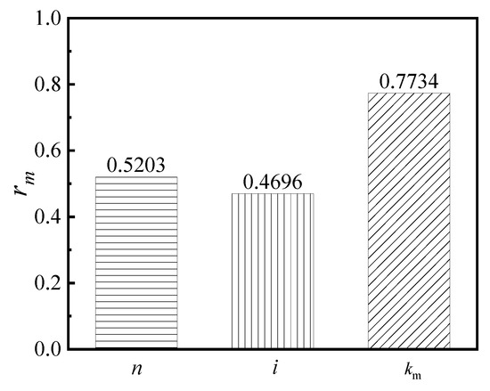 As shown in Figure 14, the correlation degree of the varying factors with respect to the energy dissipation capacity is ordered as follows: (km) > (n) > (i). Additionally, the results with respect to this are as follows: (1) the (km) and (n) possess a major correlation with the energy dissipation capacity of the S-RACFST frame, whereby the values of rm are 0.8137 and 0.7772, respectively, as well as being relatively close to each other; (2) the (i) possesses a secondary correlation with the energy dissipation capacity of the S-RACFST frame, and the correlation degree is relatively weak, whereby the rm value is 0.5314.