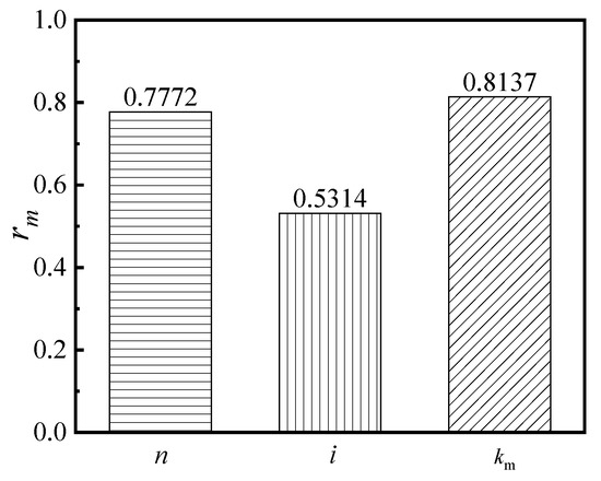 As shown in Figure 13, the correlation degree of the varying factors with respect to the ductility coefficient is ordered, as follows: (km) > (n) > (i). Additionally, the results with respect to this are also as follows: (1) The (km) possesses a significant correlation with the ductility coefficient of the S-RACFST frame, and the rm is as high as 0.7734; (2) the (n) and the (i) possess a secondary correlation with the ductility coefficient of the S-RACFST frame, whereby the values of rm are 0.5203 and 0.4696, respectively. Furthermore, the influence of the (n) on the ductility coefficient of the S-RACFST frame is slightly more significant than the (i).