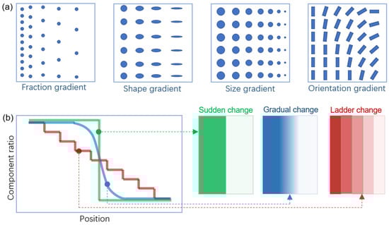 (a) Different types of gradients in functionally graded material (FGM); (b) showing schematic illustration of sudden-change, gradual-change, and ladder-change FGMs, respectively [10].