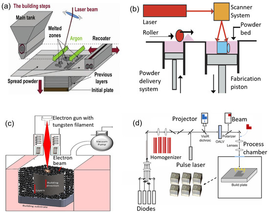 Schematics of (a) SLM, (b) SLS, (c) EB-PBF and (d) L-APBF processes.