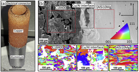 - Sing, S.; Lam, L.; Zhang, D.; Liu, Z.; Chua, C. Interfacial characterization of SLM parts in multi-material processing: Intermetallic phase formation between AlSi10Mg and C18400 copper alloy. Mater. Charact. 2015, 107, 220–227. [Google Scholar] [CrossRef]