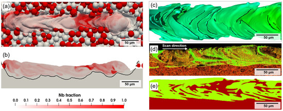 Numerical simulation distribution of Nb during powder bed fusion of Ti and Nb powders: (a) top view and (b) longitudinal cross-sectional view [57]. Interface shape and component distribution during printing IN718 powder on 316L substrate by powder bed fusion, (c) interface shape, (d) longitudinal cross-sectional view experimental results and (e) longitudinal cross-sectional view simulation results [58].
