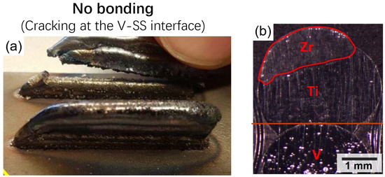 - Bobbio, L.D.; Bocklund, B.; Otis, R.; Borgonia, J.P.; Dillon, R.P.; Shapiro, A.A.; McEnerney, B.; Liu, Z.-K.; Beese, A.M. Characterization of a functionally graded material of Ti-6Al-4V to 304L stainless steel with an intermediate V section. J. Alloys Compd. 2018, 742, 1031–1036. [Google Scholar] [CrossRef]