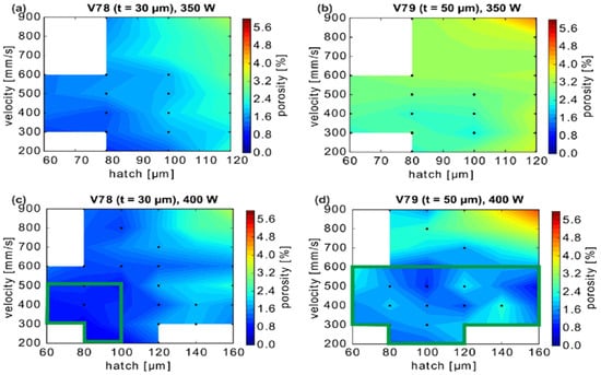 CuCrZr porosity dependence on layer height (t). The white region represents the parameter combination not measured and the black dots represent the measured process parameters. The green rectangles depict minimum porosity percentage [69].
