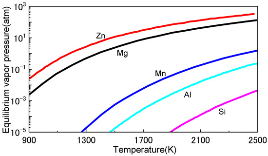 The loss of alloying elements is a critical challenge during MMAM, particularly in the printing of metal alloys. The printing process can lead to the loss of alloying elements through evaporation or oxidation, which can affect the mechanical properties and performance of the final product. Alloying elements are added to metals to improve their mechanical properties, such as strength, stiffness, and corrosion resistance. The loss of these elements can lead to reduced strength, stiffness, and corrosion resistance, and can compromise the integrity and reliability of the final product. The loss of alloying elements can occur due to several factors, including printing parameters, material properties, and design of the part. For instance, high temperatures and long printing times can lead to the loss of alloying elements through evaporation or oxidation [76]. Materials with high vapor pressures (Figure 10) are particularly susceptible to the loss of alloying elements. The design of the part can also affect the loss of alloying elements, as certain geometries can trap gases or promote oxidation, thus leading to the loss of alloying elements [77].
