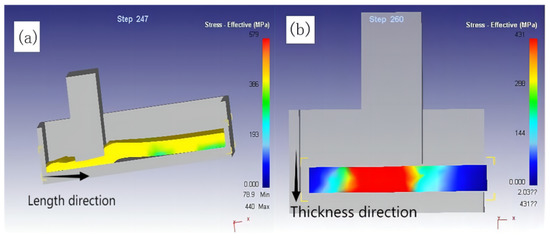 Figure 2 shows a simulation of blank deformation with or without a gap between the blank and the mould. There was no space between the precast and the mould, which caused the billet bulge problem. Too little extrusion led to uneven deformation of the billet surface and inside, and too much extrusion led to cracks on the billet surface. Wedge pressing elongated the precast in its length direction, and the end of the precast needed to be left with a space between the steel mould to prevent arching and cracking of the precast.