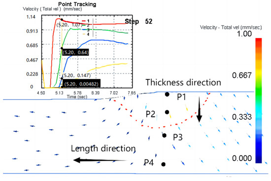 As shown in Figure 3, this can be explained by the flow behavior of the prefab during the wedge extrusion. From the preformed zone to the strain zone, which was from point P1 to point P4, the flow rate gradually decreased. This change can be attributed to the fact that the relative densities of the precast regions at points P1 and P2 were lower than those at points P3 and P4 in the strain region. In the red dashed line, the pores in the precast region collapsed and bridged, while the densification behavior of the precast region was higher than that of the strained region at strong compressive stress. The material in the precast zone flowed down the thickness direction to reduce the thickness of the slab. The material in the strain zone flowed along the length direction and the slab length increased. At the beginning of the extrusion, the slab thickness decreased due to the reduction of pores, and the slab length hardly increased (when the overall volume decreased by less than 20%). When the overall volume of the material was reduced by more than 20%, the slab length increased significantly.