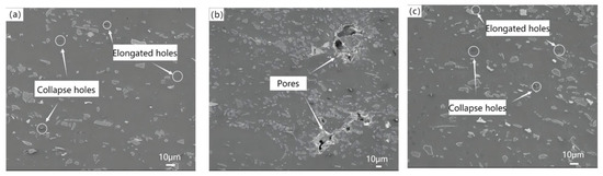 Figure 4 shows the morphologies of different parts of the material at a 20% thickness reduction rate. Figure 4a,c show that some collapse pores and elongated holes on the surface of the slab. Wedge extrusion formed 20 μm long strip holes distributed in the middle region (Figure 4b).