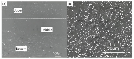 Figure 5a represents the density differentiation from the upper layer to the middle layer and then to the bottom layer. If the material was squeezed by the top and bottom molds, the SiC and precipitated particles were easy to aggregate, resulting in high density in the upper and bottom layers. In the wedge pressing process, the density distribution of the material tended to be uniform with the decrease of the overall volume and the increase of the extrusion amount. As can be seen from Figure 5b, the microstructure of the composite was also improved after wedge-shaped extrusion. The SiC particles inside the material were evenly distributed and the pores were reduced, while the performance of the material was improved to a certain extent.