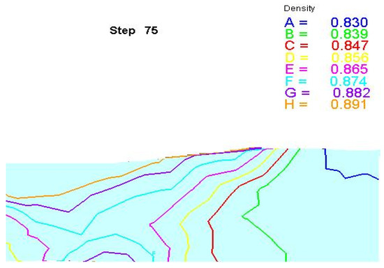 Figure 6 shows the DEM simulation results of the prefab density distribution when the total quantity was reduced by 20%. It can be found that during the extrusion process, the relative density of the upper layer was 0.891, which was higher than that of the middle layer of the composite. Moreover, the relative density decreased from the surface to the center. This can be attributed to the gradual reduction of the pressure stress from the surface to the interior.