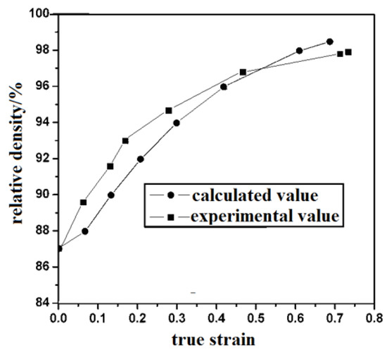 Formula (5) is the densification behavior of the loose metal material under the plane strain condition, where the constant C is determined by the initial relative density. By substituting C into Equation (5), the calculated relative density of the SiCp/Al–Fe–V–SiC material during spraying and pressing can be obtained. The comparison between the calculated relative densities of the composite and the experimental results during the extrusion are shown in Figure 7.