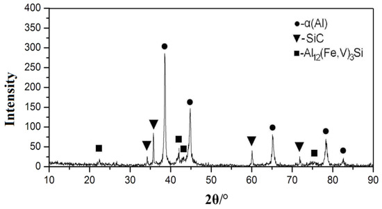 XRD in Figure 10 shows that the material was mainly composed of SiC, α-Al, and α-Al12(Fe,V)3Si. There was no significant θ-A113Fe4 in the XRD pattern, indicating that the α-Al12(Fe,V)3Si remained stable and did not transition to θ-Al13Fe4. A large number of stable precipitates (i.e., Al12(Fe,V)3Si precipitates) with a high fraction (usually 20–30%) were formed during jet deposition because SiC reinforced particles can maintain a stable strengthening effect at high temperature for a long time, while the heat resistance and strength of composites were improved.
