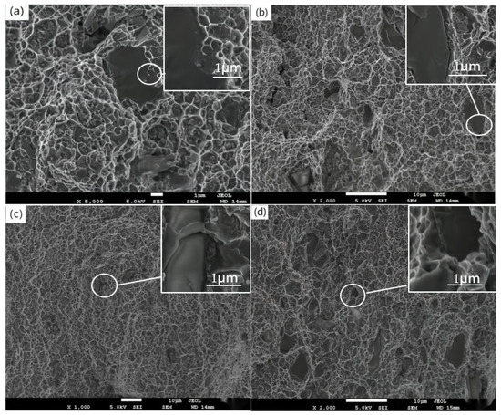 The tensile fracture of the material was observed at room temperature (26 °C). During loading, the stress accumulation near the SiC particles was much higher than that around the matrix. The SiC particles were fractured by force and the fracture surface was smooth. As shown in Figure 11a, the SiC particles remained closely bonded to the matrix after stretching, while the enlarged image shows that there was no crack at the bonding interface of the material. Figure 11b shows the tensile test results of the material at 100 °C. By observing the fracture surface, it was found that the SiC particles were still in close contact with the matrix. The enlarged image proves that there was a strong bond between the particles inside the material. As the tensile temperature increased, the number of broken particles decreased and the number of separated particles increased. If the tensile temperature was increased to 200 °C, as shown in Figure 11c, cracks appeared and expanded between the SiC particles and matrix, as shown in the enlarged image, which confirmed the increasing trend of particle detachment within the material. Figure 11d shows the tensile fracture of the material at 300 °C. With the increase of temperature, the binding force between the SiC particles and matrix became weaker, while the pits and cracks of the material increased, and the SiC particles were broken less. The enlarged image shows the pores formed by the shedding of SiC particles. The stress on the particles in the material exceeded the bonding strength between the SiC particles and Al matrix.