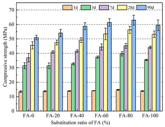 - With increasing fly ash content, the strength of the fly ash fine aggregate mortar first increased and then decreased. When the fly ash content was 80%, the mortar strength reached its maximum, with a compressive strength of 62.93 MPa and a flexural strength of 12.47 MPa at 90 d, which were 23.56% and 14.72% higher than those of the ordinary mortar, respectively. This indicates that fly ash can be used as a fine aggregate to prepare green building mortar with mechanical properties that meet application requirements and have good engineering application values.