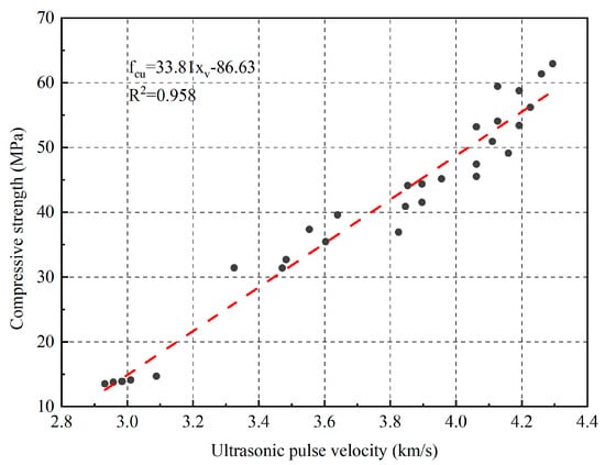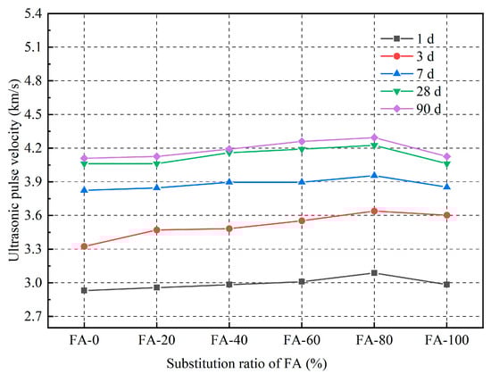 - The correlation between the compressive and flexural strengths of the fly ash fine aggregate mortar was corrected by comparing the specifications for different regions. The revised correlation model between the compressive and flexural strengths was more accurate. In addition, the variation trends of the ultrasonic pulse wave velocity and flexural compressive strength were the same, with a maximum of 4.23 km/s reached when the fly ash content was 80%.