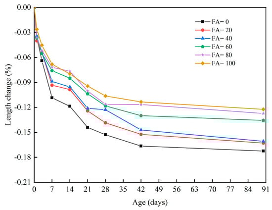 - The results of the drying shrinkage test indicated that the higher the amount of fly ash replacing the fine aggregate, the smaller the drying shrinkage strain of the mortar. The addition of fly ash significantly affected the 90 d drying shrinkage rate. At the 100% substitution level, the drying shrinkage property of the mortar reached its optimal level, and the drying shrinkage rate was reduced by 29.01% compared to that of ordinary mortar. The drying shrinkage results also indicated that fly ash inhibited the drying shrinkage of the mortar.