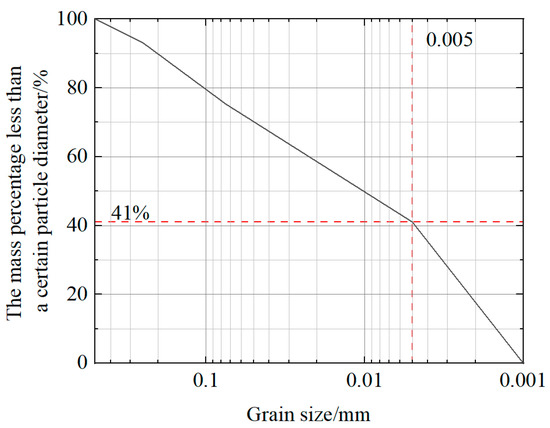 In this study, quaternary clay from Henan Province, China, was mixed with water and left to soak for 2–3 days until fully infiltrated, then made into a slurry using a high-speed mixer, sieved through a 0.05 mm sieve to remove sand, and dried to obtain the clay stone body [20]. After crushing, it was sieved through a 0.05 mm sieve and the particle size composition was 6.9% for the 0.5–0.25 mm particle size, 17.8% for the 0.25–0.075 mm particle size, 34.3% for the 0.075–0.005 mm particle size, and 41.0% for the <0.005 mm particle size, as shown in the Figure 1, which met the requirements. The analysis results of clay properties are shown in Table 2.