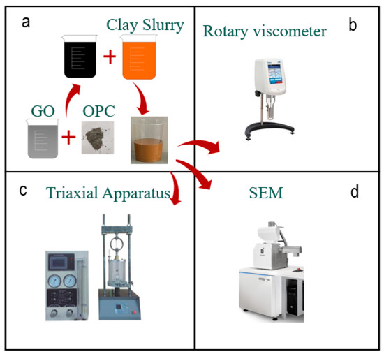 Test method and process: (a) preparation of graphene oxide modified clay cement slurry; (b) viscosity test; (c) strength test; (d) electron microscopy scanning.