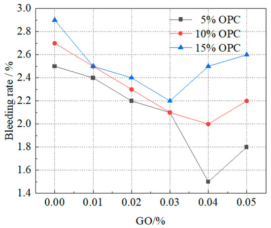 The influence of each component on the slurry bleeding rate is shown in Figure 4. It can be seen that GO had an inhibitory effect on the water loss rate of the slurry. When 100 g/L of OPC was added without water glass, the slurry bleeding rate gradually decreased with the increase in GO content from 0.01% to 0.03%, then slowly increased before stabilizing. When 10 mL/L of water glass was added, the slurry bleeding rate increased with the increase in OPC content. The results indicated that a small amount of GO has an inhibitory effect on the slurry bleeding rate, which gradually weakens with the increase in GO content.