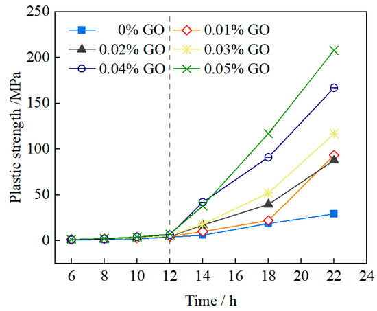 The plasticity feature is the late effect of the rheological characteristics of the slurry, and it plays a crucial role in resisting infiltration and water plugging. The results of the slurry’s plastic strength are shown in Figure 5. The following can be observed: (1) the plastic strength of the slurry with different mix ratios exhibited the same trend. Before 12 h, the plastic strength remained at a relatively low level, gradually increasing moderately, and then explosively increasing exponentially after 14 h; (2) compared with the control group, the plastic strength of the slurry significantly increased with the increase in GO content from 0.01% to 0.05% after 12 h, indicating that GO plays an optimal role in the early-stage water plugging performance of the slurry, consistent with the rules of the viscosity thixotropy mentioned earlier.