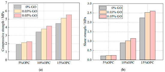 Effect of GO and OPC content on strength of the specimens (water glass of 10 mL/L): (a) compressive strength; (b) shear strength.