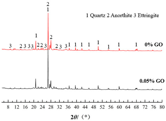 The content of GO with 0% and 0.05% were tested via XRD between 5° and 80° after 7 d of curing. The X-ray diffraction spectra are shown in Figure 8. Diffraction peaks of quartz and ettringite were observed in the figure. The diffraction peak of calcian feldspar also appeared in the spectra, which is a hydrated product of the sample chemical reaction. The formation of calcian feldspar is crucial to enhance early strength. It can be seen that there was no significant difference in the diffraction peaks of the two samples’ XRD spectra, whether or not GO was added. The research of Balaji and Yang [29,30] showed a similar situation. This is mainly due to the fact that GO accelerates the hydration process but does not change the types of hydration products. The recognition peak of GO is not visible in the XRD diffraction pattern because of the very small amount of GO and the very high strength of the crystalline phase composition of the clay [31,32].