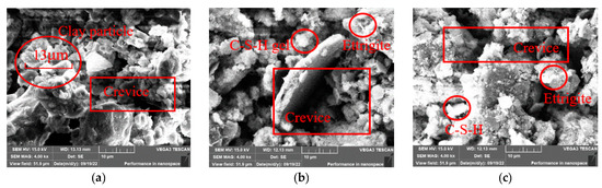 Figure 10 shows the microstructure of the slurry compact body with different OPC content when the GO content is 0.03%. Comparing Figure 10a with Figure 9a, it can be observed that the cement hydration products are completely wrapped around the clay particles, and the volume of the clay-cement aggregate increases. The internal voids in the system are filled and bonded, forming a dense structure. When the OPC content is 10% and 15%, the cement hydration products are completely wrapped around the clay particles without any obvious exposure. However, when the OPC content is 15%, some hydration products are not completely wrapped around, and the addition of GO can transfer more cement hydration products into microcapillary pores and bridge the microcracks in the material, thus improving the material properties. Such a structure provided greater help in the improvement of the physical and mechanical properties of the sample, a result that is similar to the results of other studies [33].