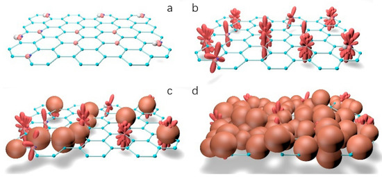 Microscopic growth process model of stone body: (a) graphene oxide structure; (b) cement hydration process; (c) clay adsorption process; (d) clay-cement particle agglomerate skeletal structure.