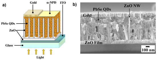 - Leschkies, K.S.; Jacobs, A.G.; Norris, D.J.; Aydil, E.S. Nanowire-quantum-dot solar cells and the influence of nanowire length on the charge collection efficiency. Appl. Phys. Lett. 2009, 95, 193103. [Google Scholar] [CrossRef]