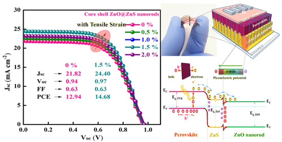| Flexible PET/ITO, ZnO nws/ZnS | [2021], [114] | 24.4 | 0.97 | 14.68 * |